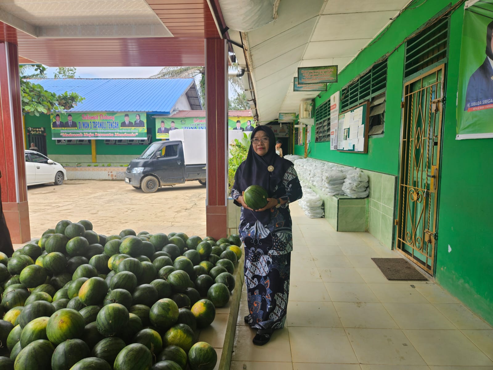 Kepala MAN 3 Tapanuli Tengah Hj. Juraida Siregar, S.Ag., M.Pd tampak sangat antusias dalam mendukung pelaksanaan program tersebut. Beliau hadir secara langsung untuk memantau jalannya kegiatan sekaligus menyapa peserta didik yang mengikuti pembagian makan bergizi gratis.