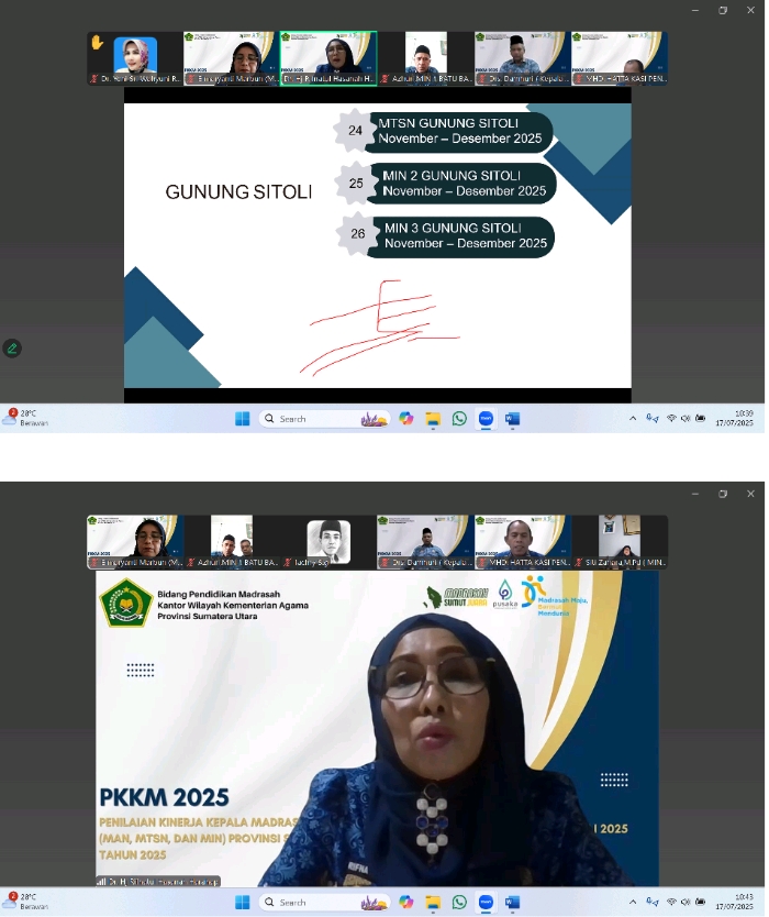 Pandan (Humas). Dalam semangat evaluasi dan perbaikan berkelanjutan, Kepala MAN 1 Tapanuli Tengah, Elmaryanti Marbun, S.Ag., M.Hum., turut serta dalam Zoom Meeting Penilaian Kinerja Kepala Madrasah (PKKM), dilaksanakan 19 Juli 2025. Kegiatan ini dipimpin langsung oleh Ketua Tim Tenaga Kependidikan Kanwil Kemenag Sumut, Dr. Hj. Rifna Hasanah, S.Ag, MH.